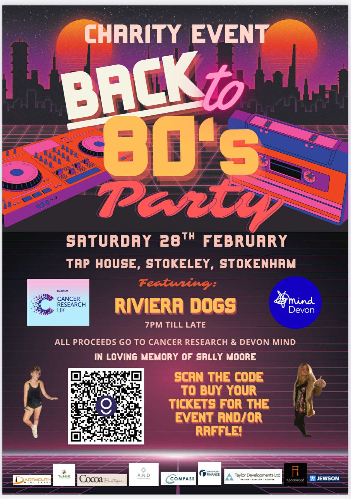 Charity Event – Back to 80’s Party. An unforgettable 80’s Charity Night in aid of Devon Mind and Cancer Research. Ticketed event. Purchase tickets and find out more here: https://gvwhl.com/V816W