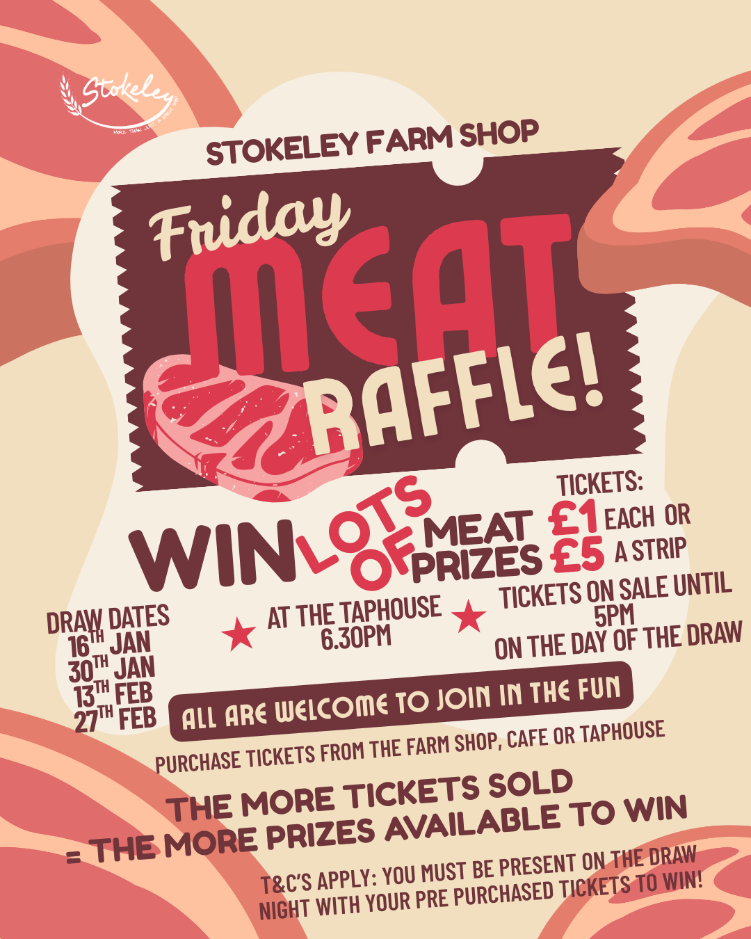 Mighty meat giveaway in a fortnightly draw. Tickets are £5 a strip, the more tickets sold, the more selection of meat prizes available. Drawn at 6.30pm in the Taphouse. Draw dates: 16th January, 30th January, 13th February & 27th February. Tickets available to purchase up until 5pm on the day of the draw. T&C’s apply: you must be present with your tickets on draw night to win.
