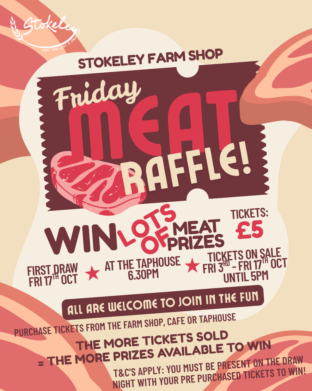 Mighty meat giveaway in a fortnightly draw. Tickets are £5, the more tickets sold, the more selection of meat prizes available. First draw Friday 17th October 6.30pm. T&C’s apply: you must be present with your tickets on draw night to win.
